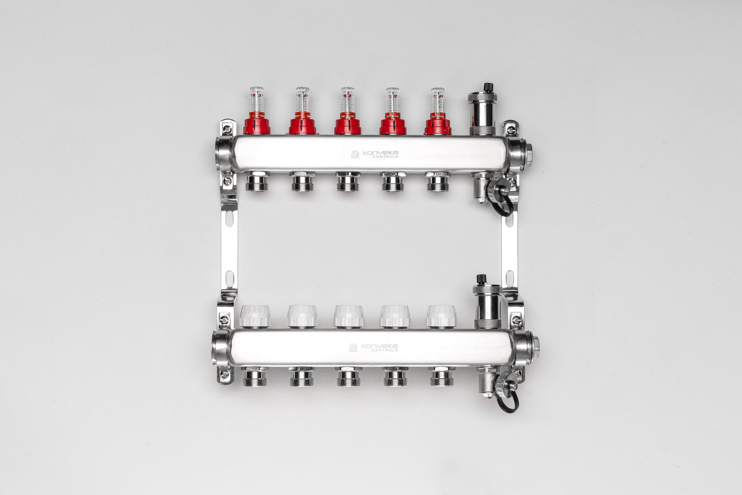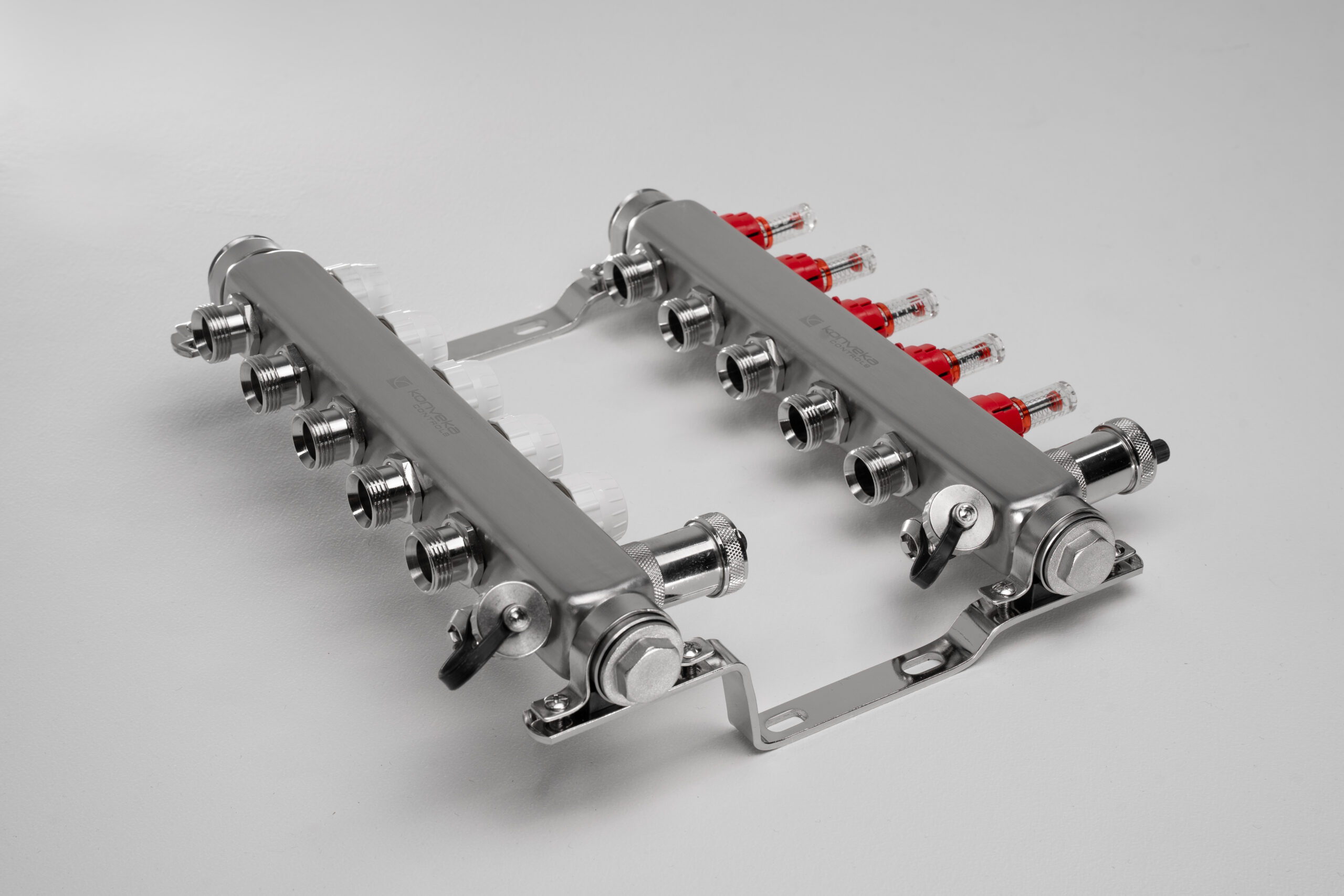Adjustable manifolds with integrated flow meters are designed for distribution and balancing of water flow in all types of heating-cooling systems. Each circuit has a separate flowmeter (flow meter), which allows you to precisely regulate and monitor the flow of the heat carrier in each heating branch.
