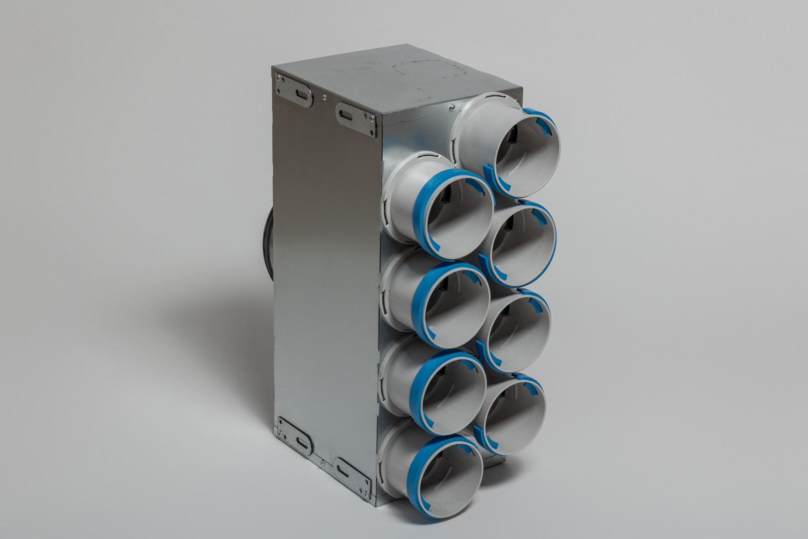 Collector boxes are designed for distributing supply or exhaust air in ventilation systems that use DN75 flexible ducts. The box connects the main duct to separate distribution channels, ensuring even air distribution to different rooms. The branches are usually DN75 with click-type connections or rubber seals, which ensure air tightness without additional sealing. The box can be mounted on the floor, ceiling, or in special shafts.