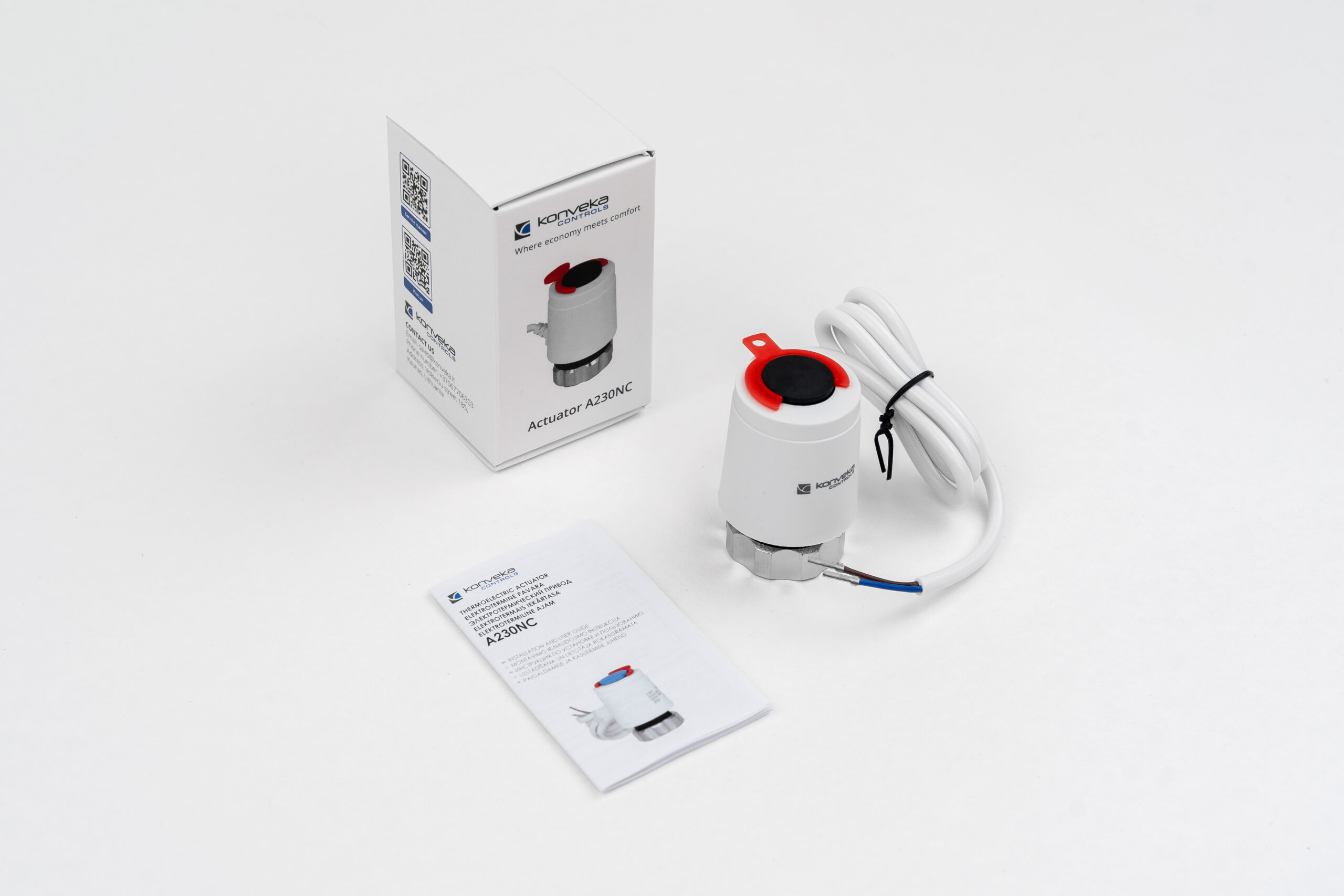 The A230NC electrothermal actuator (normally closed) is designed to control thermostatic valves or manifolds in heating and cooling systems. It can be controlled by a controller that sends an on/off signal or by a switch. This type of control allows for economical use of heat and/or cold in systems such as underfloor heating, radiators, fan coils, convectors, etc.