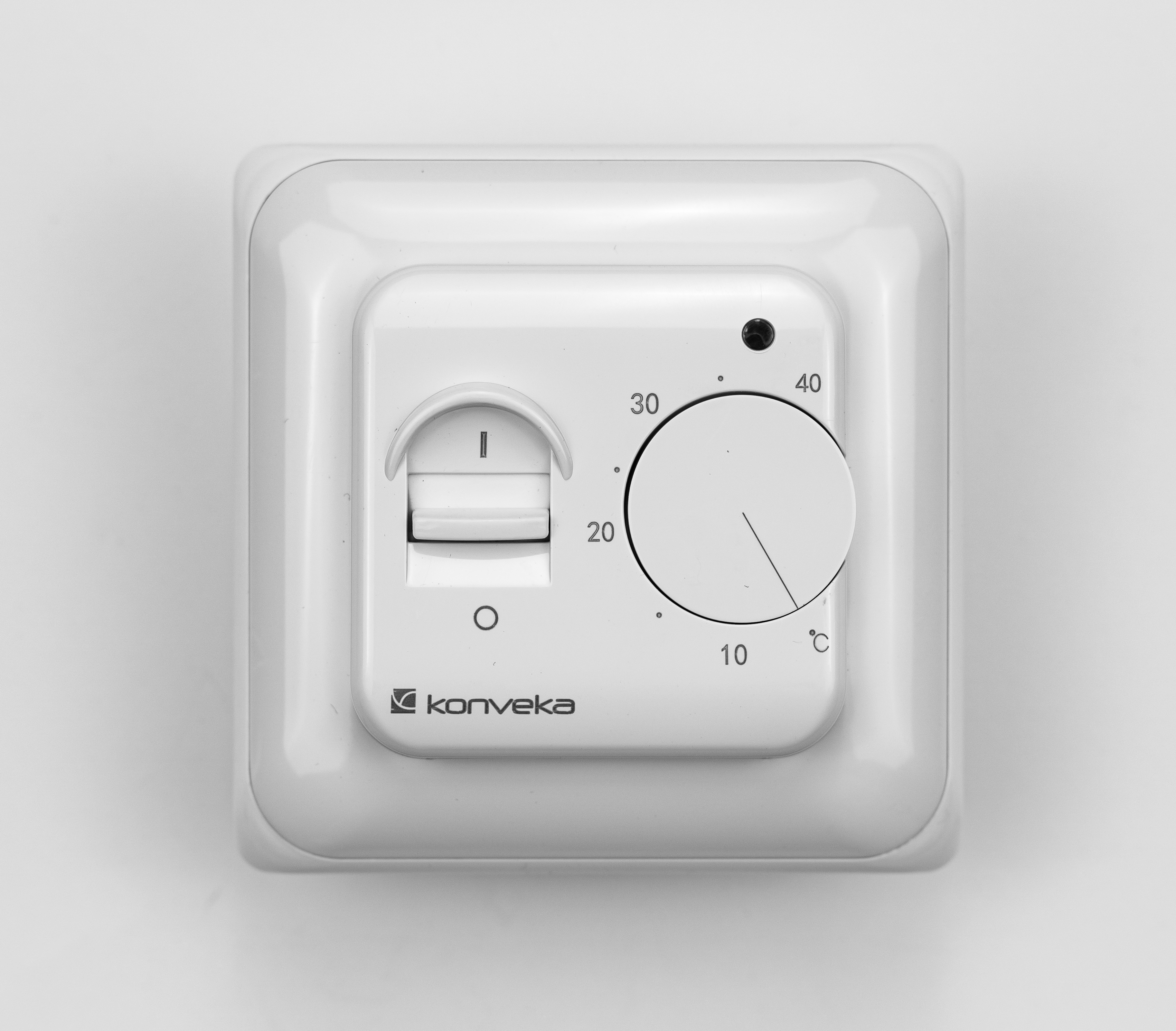 The room thermostat is designed to regulate the room temperature in electric or hydraulic floor heating systems. The thermostat is controlled by turning the control knob. The LED indicator shows the status of the heating system.