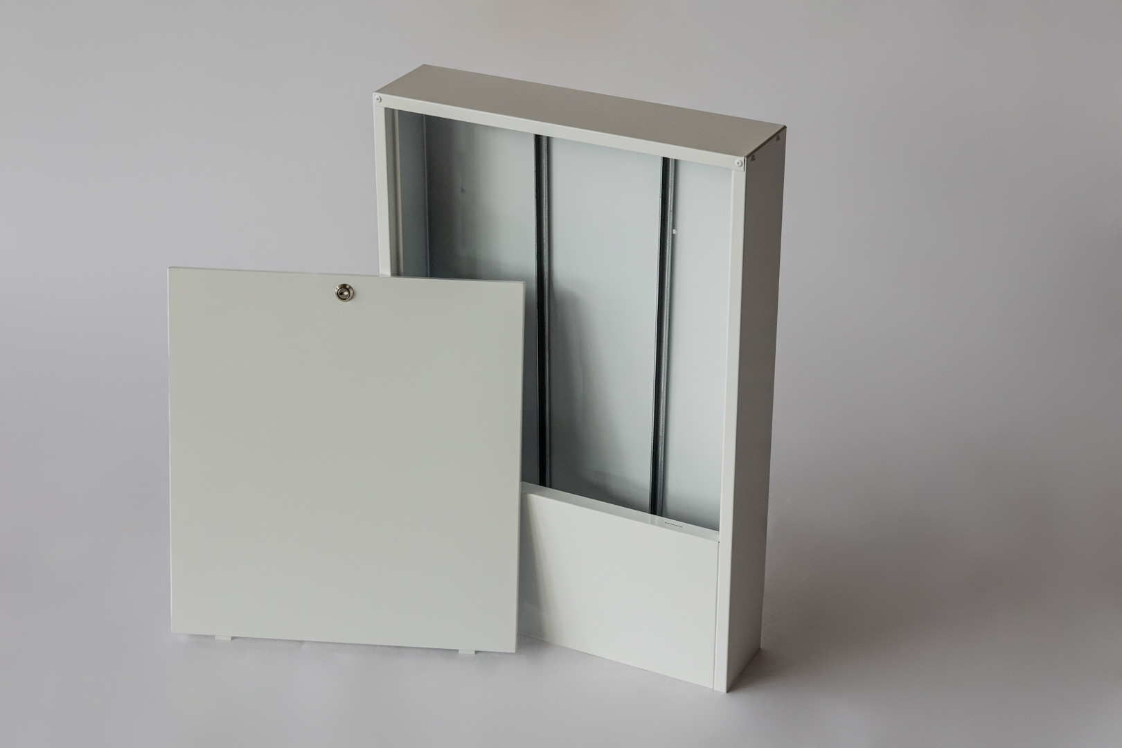 Manifold cabinets are designed for the installation and protection of heating and cooling system manifolds. They conceal manifolds and pipes, ensuring convenient access for adjustment and an aesthetic appearance in the interior. The cabinets are made of powder-coated galvanized steel and are resistant to corrosion and mechanical damage. Depending on the installation requirements, you can choose between a recessed or surface-mounted (wall-mounted) version.