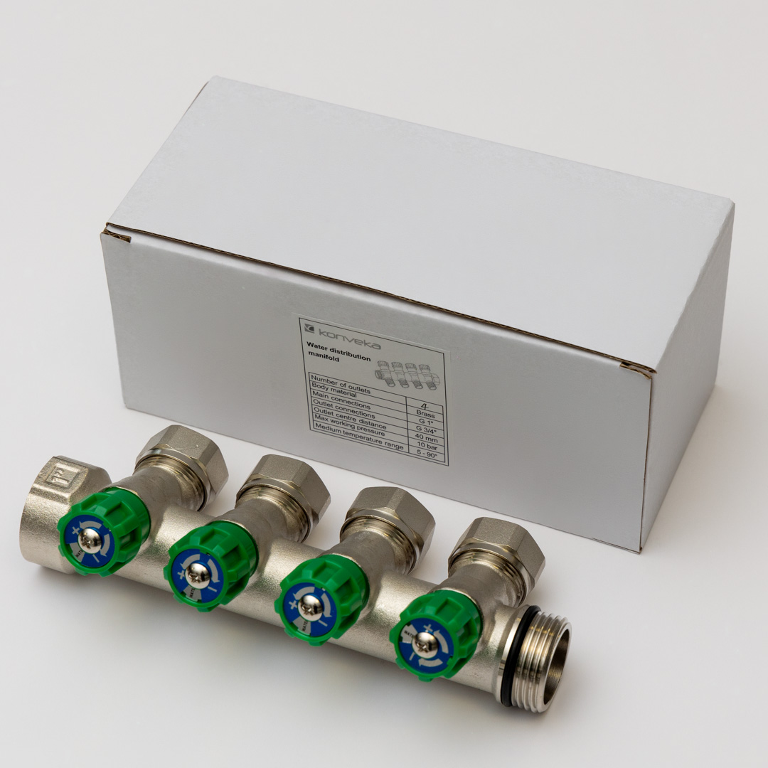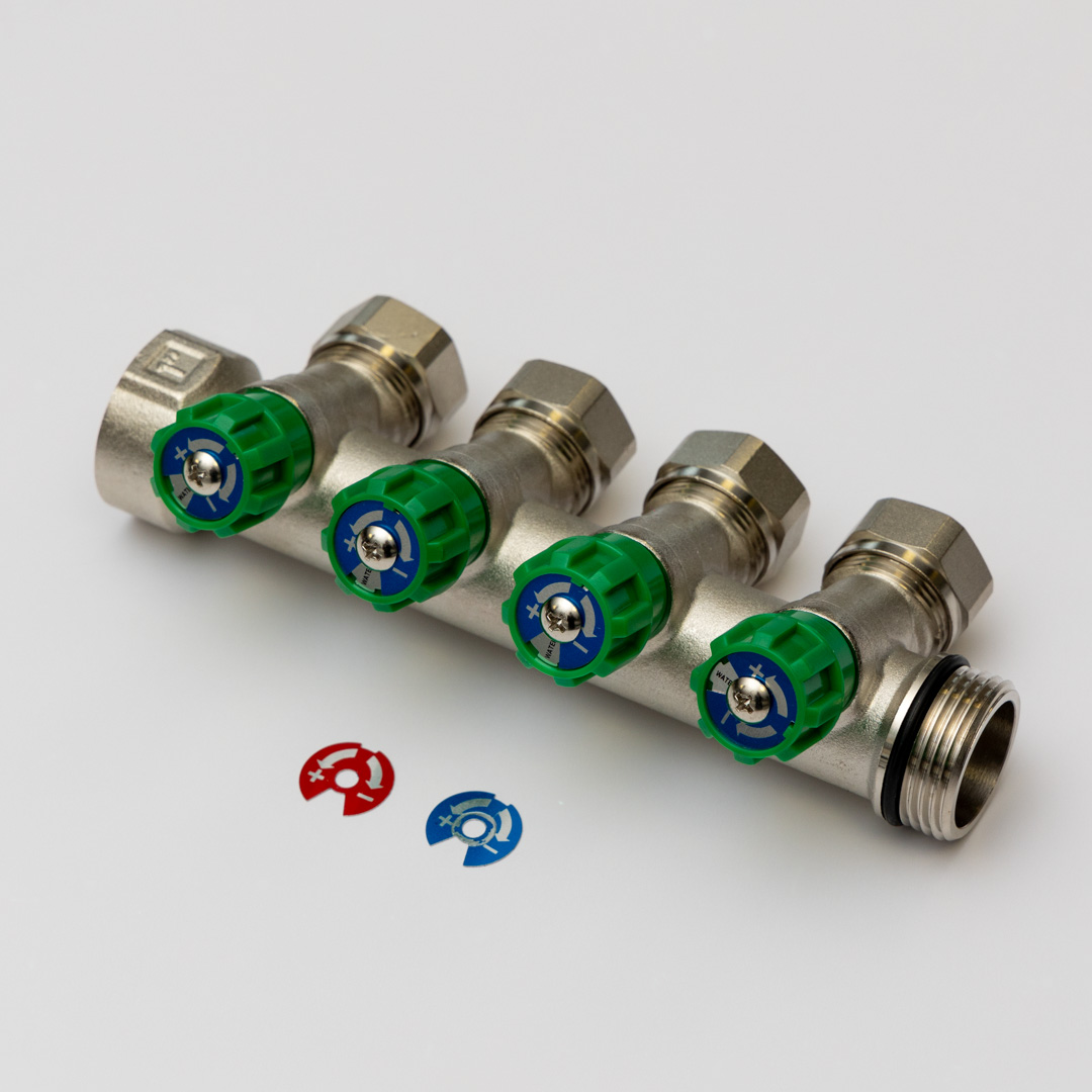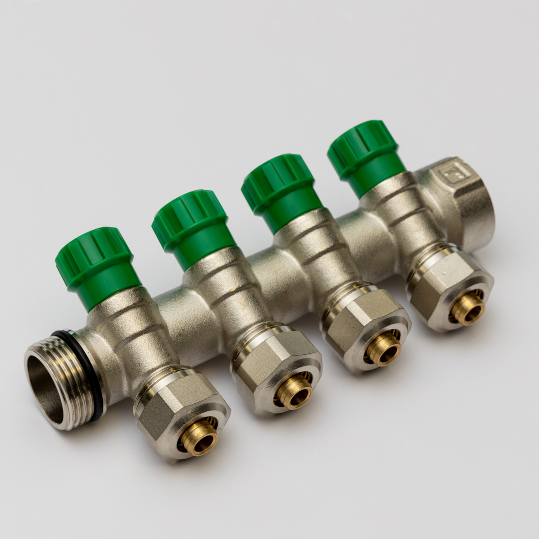Water supply manifolds are designed for the even distribution of cold and hot water to individual consumption points, such as mixers, showers, washing machines, etc. Each branch of the manifold allows individual control or complete shut-off of the water supply to a specific circuit, making the system convenient to operate and easy to maintain. If necessary, when the number of branches of a single manifold is insufficient, several manifolds can be connected together in a group. The branches are designed for use with Eurocone type connections. Made of nickel-plated high-quality brass HPb58-3, they ensure resistance to corrosion, pressure, and high temperatures.